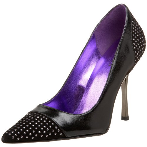 No one will doubt your fashionista status with these divalicious Guess by Marciano Carlile pumps. Leather upper in a slip-on dress pump style with a pointed toe. Heavily studded toe and heel overlays. Smooth metallic lining and lightly padded footbed, dress midsole. Flat traction outsole. Metallic 4 inch stiletto heel.