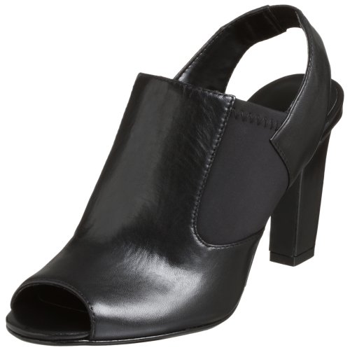 Stay ahead of the curve in these modern Dagmar slingbacks by Moda Spana. Smooth leather upper in a slingback hybrid dress mule style with a round open toe. Stretch elastic fabric side inlays and an elasticized leather slingback heel strap offer easy slip-on fit. Faux leather lining and cushioning insole, flat traction outsole. 2 3/4 inch faux leather wrapped tapered heel.
