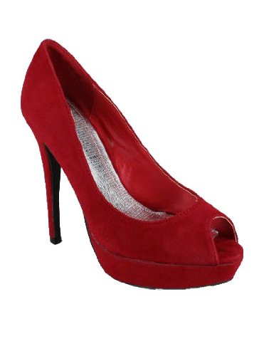 Peep toe platform pump cpvered in an imitation suede. Heel height: 5 inches. Women's whole & half sizes. All Man Made Material. Imported.