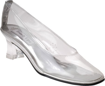 Start your happy ending with the beautiful Cinderella pump by Touch Ups. Clear vinyl upper in a contemporary dress pump style with a round toe. and softly scooped vamp. A metallic stitched overlay accents the back of the heel. Vinyl lining and metallic faux leather cushioning insole, flat traction outsole. 2 inch clear acrycic sculpted heel.