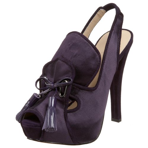 Fabulously funky and shamelessly chic, this wild design from Velvet Angels is sure to impress. The dramatic upper features a peep-toe front, layers of luscious satin, and a patent leather tasseled bow tie. The elasticized slingback strap helps keep your foot in place, while the hidden platform and skyscraper-high heel perfectly complete this stunning look.