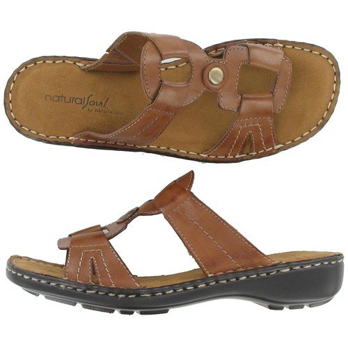 The Cedric slip-on sandal from Natural Soul by Naturalizer features a smooth and synthetic upper, decorative stitching accents with cutout details, metal stud accent on the vamp, round toe, lightly cushioned footbed and a synthetic outsole.