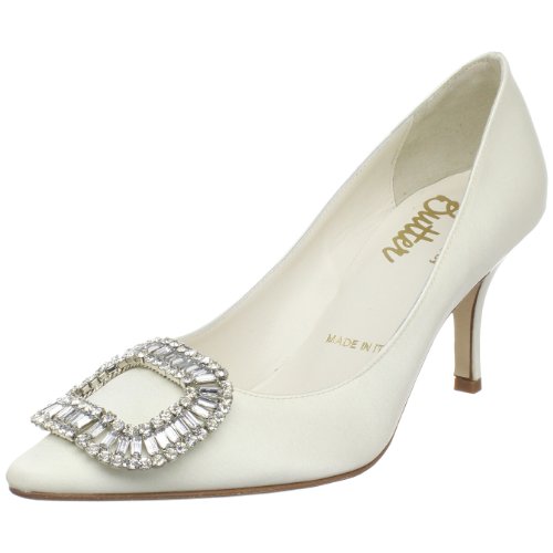 Add sophisticated style to your wedding ensemble with the Cossette-B pump from Butter. Crafted in Italy, this elegant shoe features a lustrous satin upper and clean, classic lines. Reminiscent of a vintage brooch, a jeweled embellishment at the toe adds tons of sparkle. Plus a pointed toe and slender high heel create an alluring silhouette.